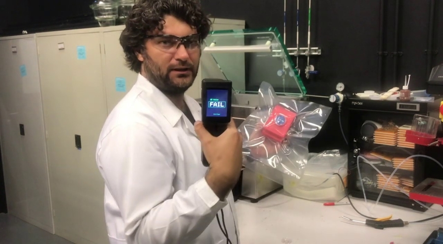 Demonstration of a new packaging-integrated oxygen sensor. The sensor prototype was inserted in to a vacuum bag together with polyethylene foam sample mimicking a food product. 60 sec of vacuum was applied. The measurement has been done immediately after the bag was sealed and damaged. The sensor measures absolute amount of oxygen molecules inside the package. It can be used to remove leaking packages from the supply chain.